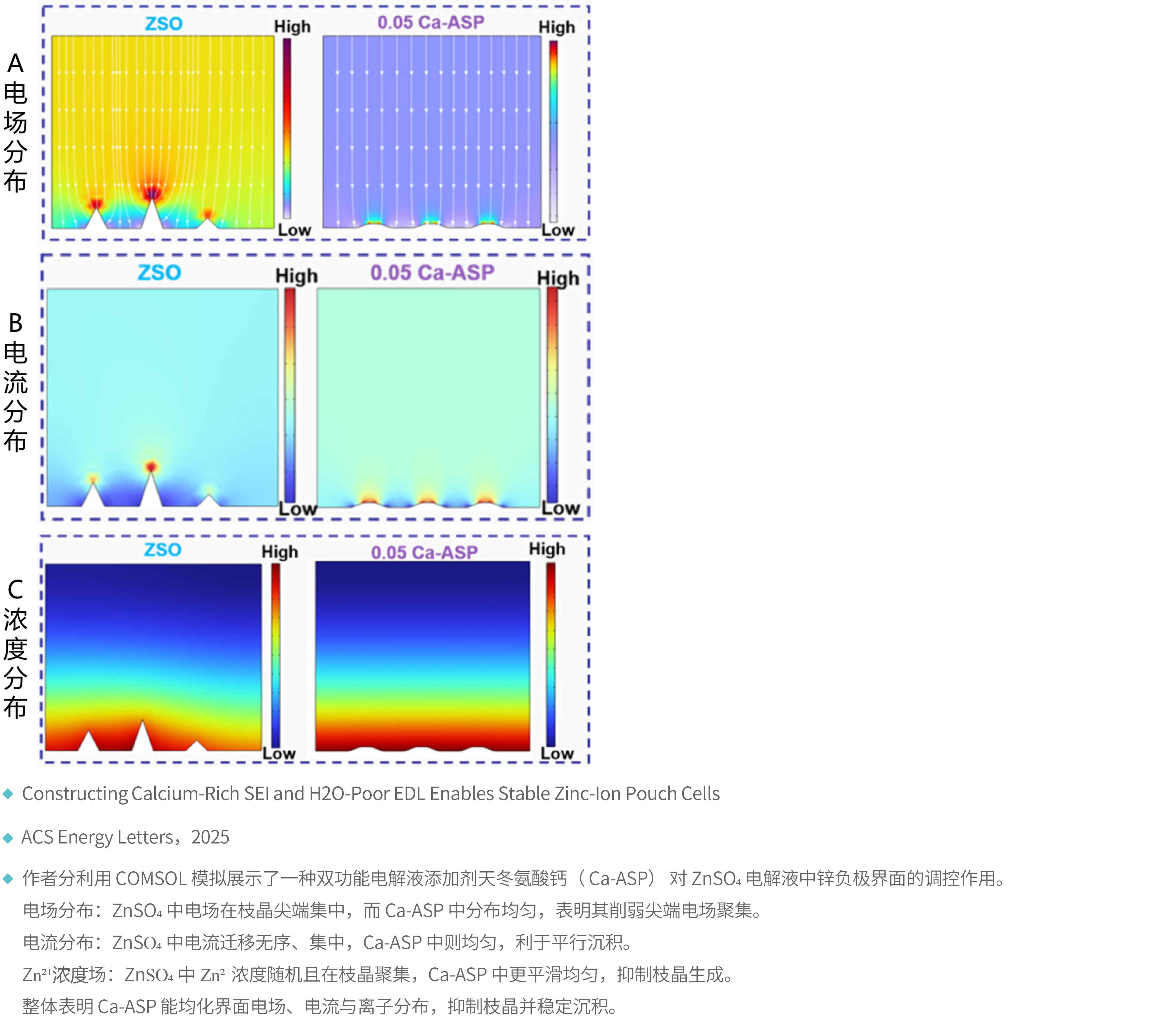 通过相场仿真技术,模拟在不同电场或离子浓度下的金属离子沉积过程,揭示枝晶生长机理和改性机理。