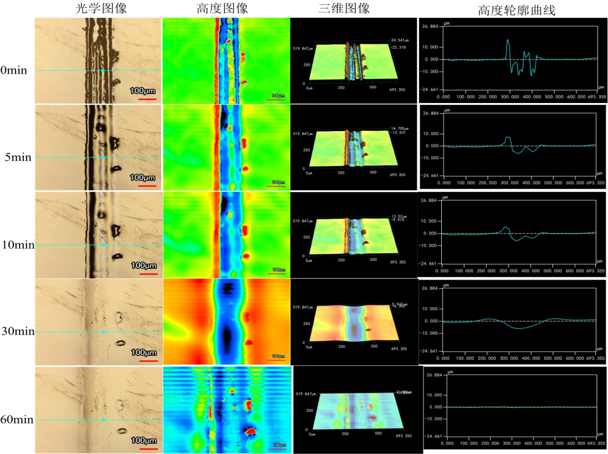 记忆聚合物划痕恢复三维形貌和高度轮廓线